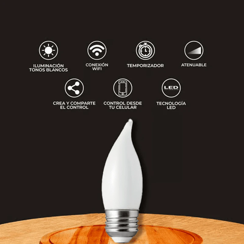 El Foco Vela Inteligente combina el diseño clásico de vela con tecnología moderna, ofreciendo luz blanca dinámica de 2700 K a 6500 K regulable según tus necesidades. Su filamento LED integrado de 5.5 W permite hasta un 90% de ahorro energético y se adapta a bases E27 tradicionales. Controla encendido, apagado y atenuación desde la app Tecnolite Connect, smartwatch o mediante comandos de voz con Alexa, Google Assistant y Atajos de Siri. Con un flujo luminoso de 700 lm y ángulo de dispersión de 360°, proporciona iluminación uniforme y eficiente en cualquier espacio, ideal para crear ambientes cálidos o neutros.