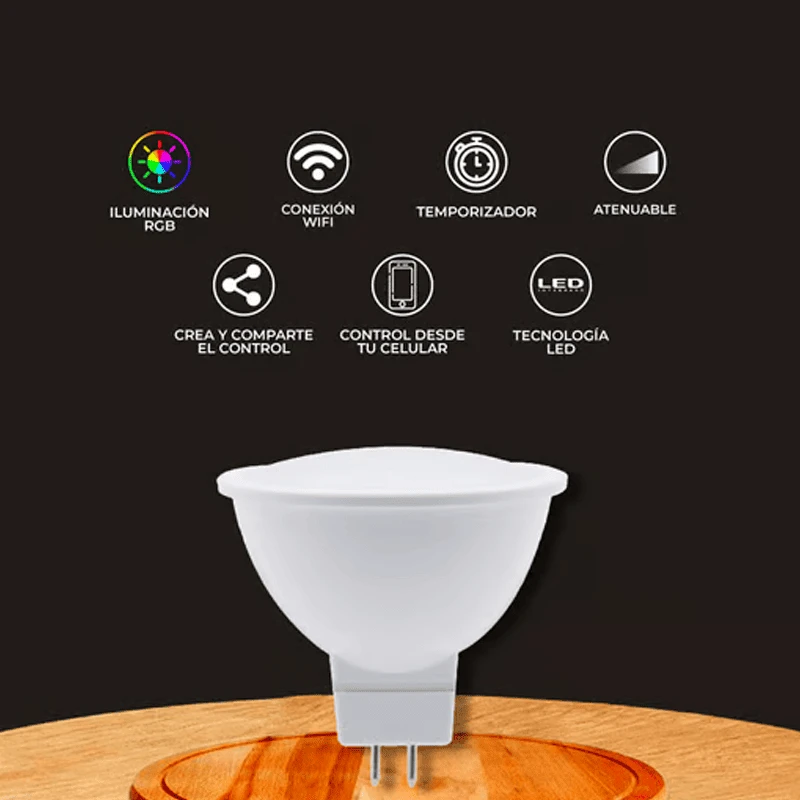 El Foco Inteligente MR16 FLASH SMART RGB combina 64 mil tonos de blancos con 16 millones de colores RGB, permitiendo crear ambientes personalizados y ajustar la intensidad desde tu dispositivo móvil o smartwatch. Con 5 W de potencia y base estándar GX5.3, este foco LED integrado ofrece un flujo luminoso de 400 lm y un ángulo de dispersión de 105°, ideal para iluminación decorativa o acento en interiores.